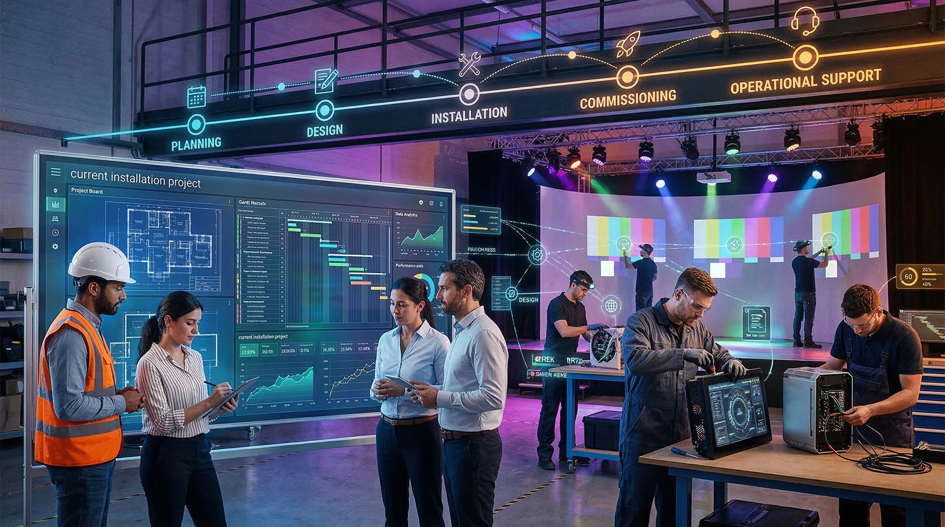 Timelines vary by scope, but most projects move through structured phases — planning, design, system development, integration and commissioning — aligned with institutional and event schedules.