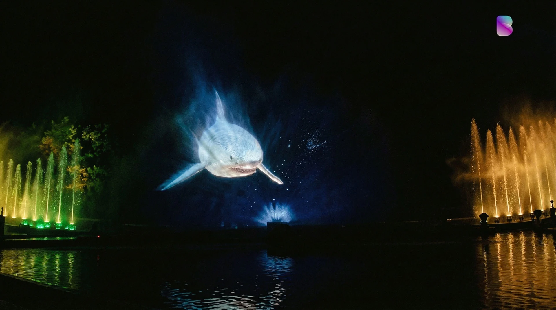 The final installation creates a large-format outdoor visual attraction that combines projection technology and water-screen environments to deliver an engaging public experience.