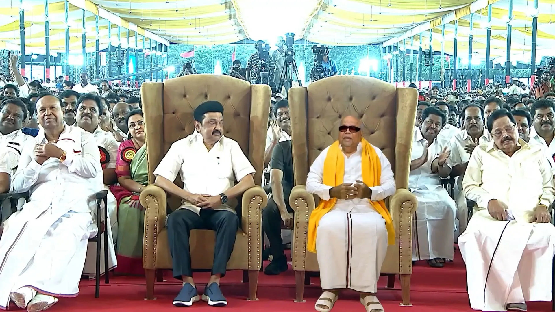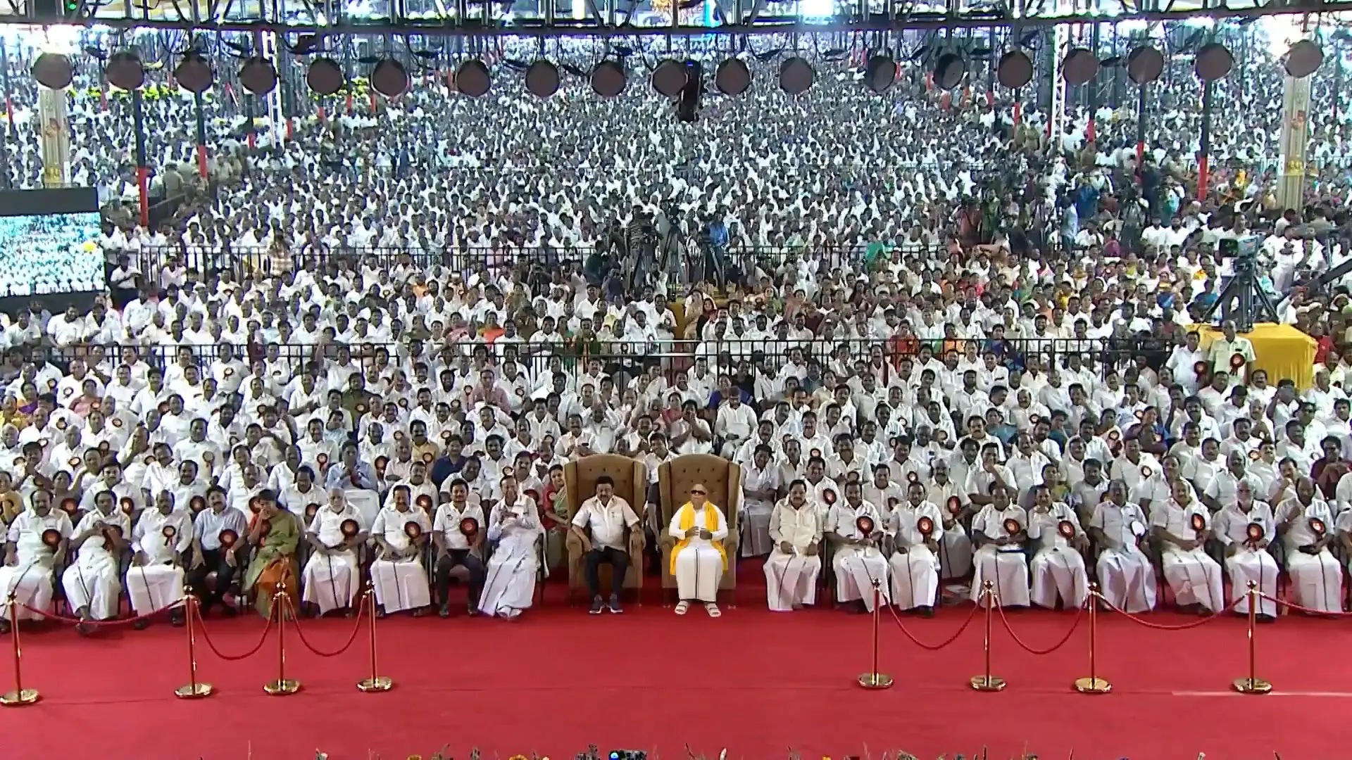 During the anniversary celebration of the Dravida Munnetra Kazhagam (DMK) in Chennai, the organisers sought to create a unique stage experience that would symbolically bring Thiru M. Karunanidhi back to address the audience.