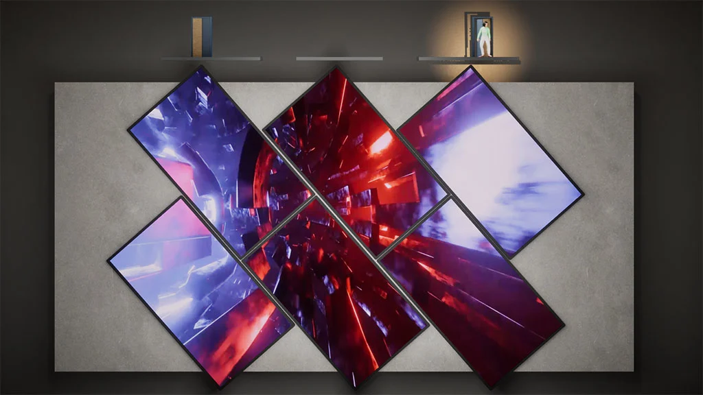 Sculpted muSculpted multi-screen storytelling integrated within architectural forms to create immersive and visually compelling narrative experiences.lti-screen storytelling in architectural form.