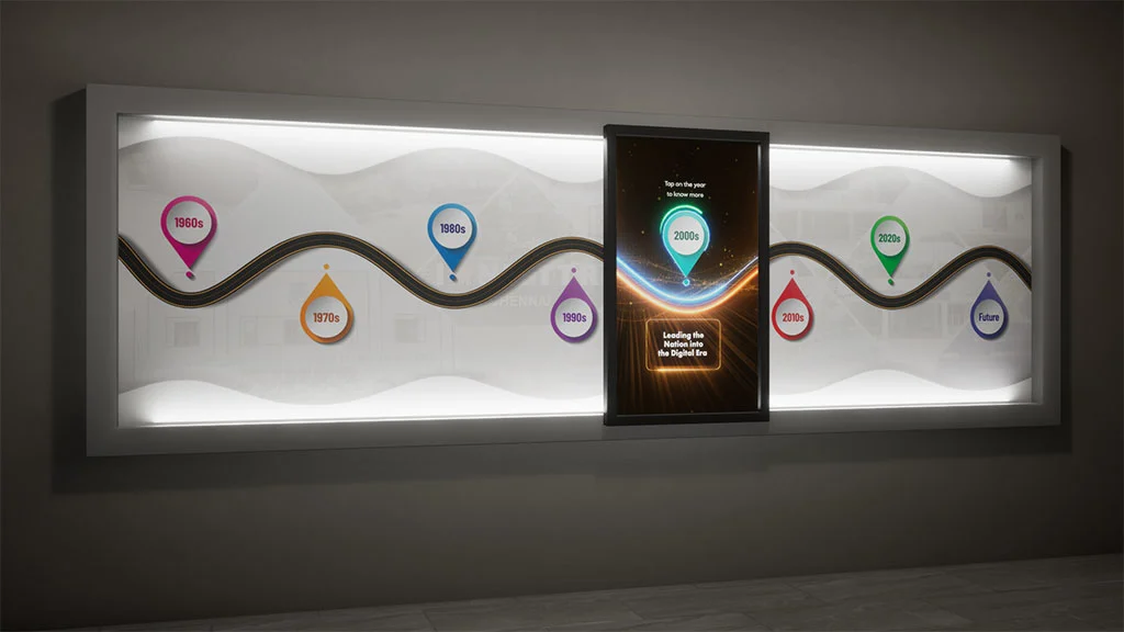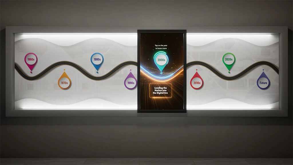 Ideal for corporate and government interpretation centres, Motion Wall communicates layered information through an intuitive, space-efficient format. Designed for permanent institutional integration, it delivers durable, scalable interaction while preserving architectural aesthetics.