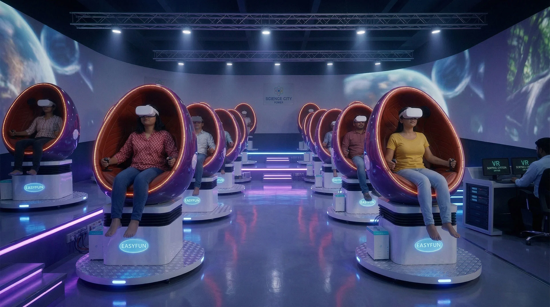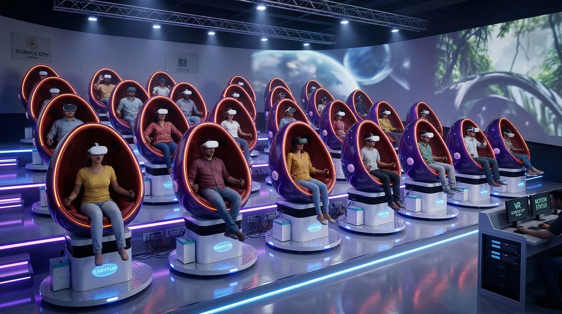 A fully integrated VR motion theater installation featuring synchronized VR experiences, motion-enabled seating and untethered VR systems designed for immersive group experiences at Science City, Patna.